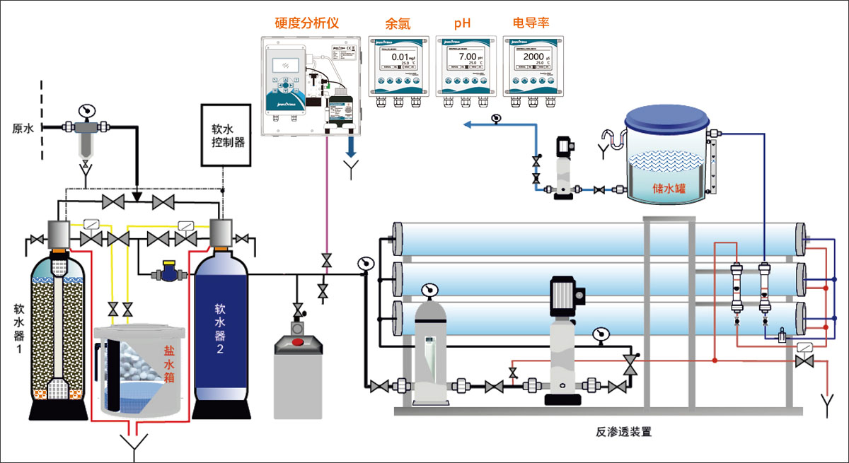 水中的硬度和余氯直接影響反滲透膜的使用壽命和產水回收率,在線檢測硬度和余氯對RO系統(tǒng)至關重要。
