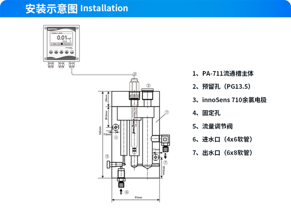 當(dāng)流通槽連續(xù)有水樣通過時(shí),才可以將電極插入流通槽的電極孔中,并保證 innoSens 710一直浸泡在水樣中。如果流通槽長(zhǎng)時(shí)間失水,務(wù)必將電極取出,用原有保護(hù)套套好,保護(hù)套必須保證有保護(hù)液。