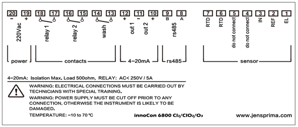 控制器的連接端子位于儀器內(nèi)部,打開蓋板,進(jìn)行電源、電極和信號(hào)輸出的接線。